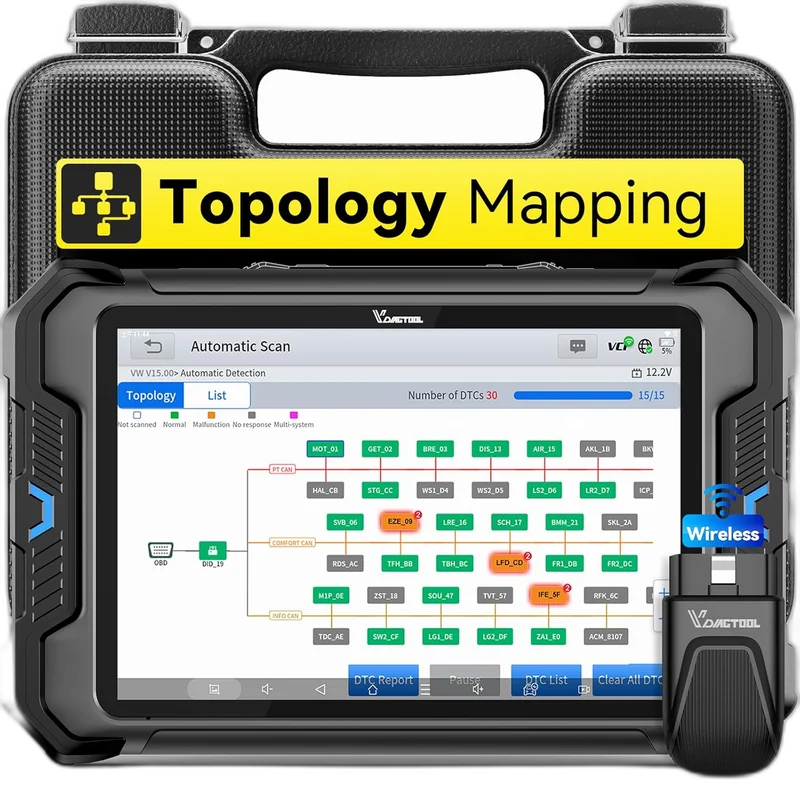 Côté fiche technique : Protocoles : OBD-II + CAN FD + DoIP, Systèmes : Tous systemes, Bluetooth, Bidirectionnel, MAJ : 3 ans gratuites, Langues : FR/EN/DE/ES/IT, Écran : Tablette Android 8 pouces.